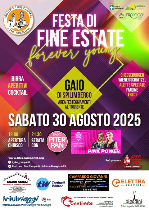 Unisciti a noi per una indimenticabile festa di FINE ESTATE, presso l'area festeggiamenti "al torrente" a Gaio di Spilimbergo